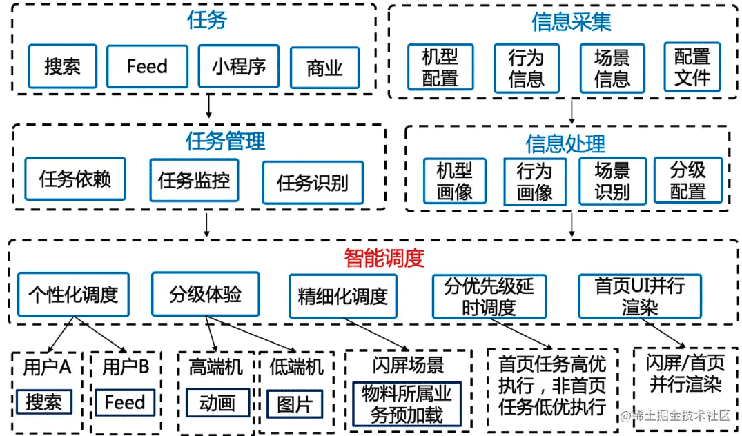 输出为不同的调度形态, 有个性化调度(不同用户运行时初始化不同业务)、分级体验调度(用户不同配置机型不同效果)、精细化调度(基于场景做调度)、分优先级延时调度(任务延迟调度支持设置优先级, 调整任务顺序)和首页 UI 并行渲染技术(主要指商业闪屏和主页并行渲染), 业务可根据预加载任务执行诉求快速接入调度实现优化。在任务调度中, 会为特殊业务做针对性调度, 赋能业务, 如闪屏和首页并行渲染, 提升商业请求成功率, 进而商业收入