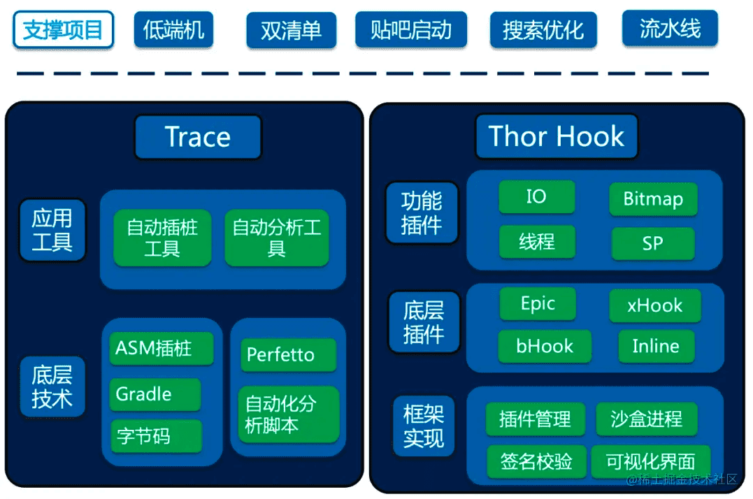 - trace 工具: trace 工具以 ASM 插桩为基础, 结合 Perfetto 相关能力, 做到可视化和自动化分析