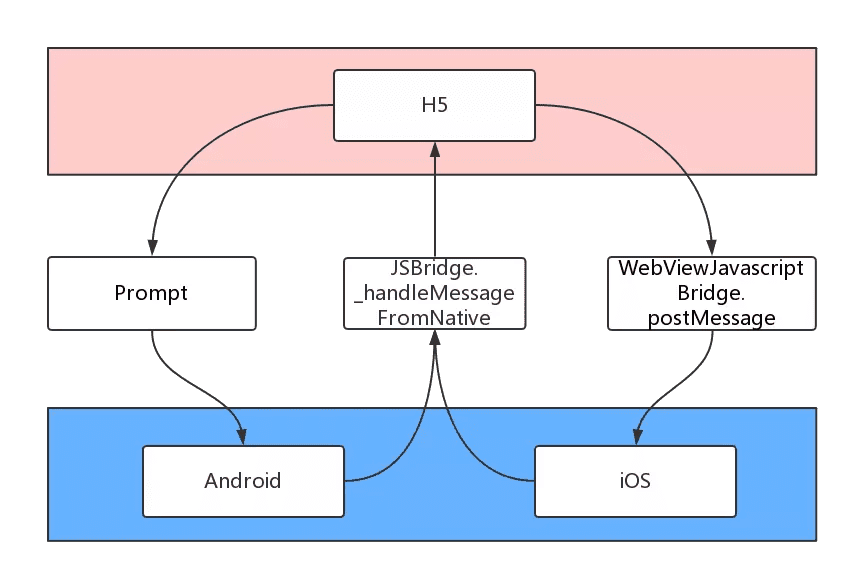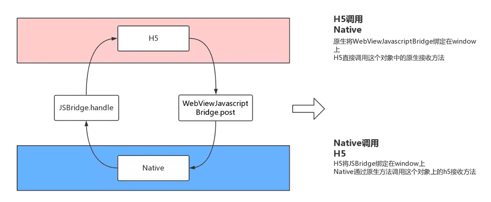 在 JSBridge 的设计中, 可以把前端看做 RPC 的客户端, 把 Native 端看做 RPC 的服务器端, 从而 JSBridge 要实现的主要逻辑就出现了: 通信调用(Native 与 JS 通信) 和 句柄解析调用。(如果你是个前端, 而且并不熟悉 RPC 的话, 你也可以把这个流程类比成 JSONP 的流程)